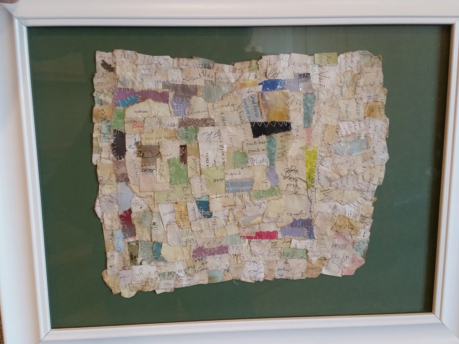 Grief - Following the deaths of my elderly parents four days apart in 2013 left me in emotional turmoil because of the complexity of my relationship with them. I tore the sympathy cards I received into small pieces several months after their passing to make paper. Saving the remaining pieces of cards, I hand sewed them together. The process of completing the "paper quilt" led me to peace.